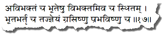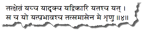 ![]() ![]() "Природа, наслаждающийся и сознание"Йога равлечения Итак - материально тело, которое нам выделено на эту жизнь называется в этом стихе полем. А мы не тело, мы не поле, мы те, кто должны понять это поле, вспахать это поле, засадить это поле и в конце концов извлечь из него максимальную пользу. Это похоже на задачу, которая стоит перед садоводом. Каждый весну надо посадить рассаду, вспахать огород, высадить растения в правильном порядке, окучивать их, поливать, бороться с вредителями и, в конце концов, собрать хороший урожай. И в зависимости от наших желаний нам дается либо большое поле в несколько гектар, либо маленькое - в 6 соток, а кому-то и горшка с кактусом на подоконнике вполне достаточно. Есть слоны, есть комары - это просто разные садоводы-любители ТЕКСТЫ 1 - 2![]() арджуна увача шри-бхагаван увача арджунах увача - Aрджуна сказал; пракритим - природу; пурушам - наслаждающегося; ча - также; эва - непременно; кшетрам - поле; кшетра-джнам - знающего поле; эва - непременно; ча - также; этат - все это; ведитум - узнать; иччхами - я желаю; джнанам - знание; джнейам - объект познания; ча - также; кешава - о Кришна; шри-бхагаван увача - Верховный Господь сказал; идам - это; шарирам - тело; каунтейа - о сын Кунти; кшетрам - полем; ити - так; абхидхийате - называют; этат - это; йах - тот, кто; ветти - знает; там - он; прахух - именуют; кшетра-джнах - знающим поле; ити - так; тат-видах - те, кто знает это. Aрджуна сказал: О Кришна, я хочу узнать о пракрити [природе], пуруше [наслаждающемся], о поле и знающем поле, а также о том, что есть знание и объект познания. Верховный Господь сказал: Это тело, о сын Кунти, называют полем, а того, кто знает тело, - знающим поле. ТЕКСТ 3![]() кшетра-джнам чапи мам виддхи кшетра-джнам - знающего поле; ча - также; апи - безусловно; мам - Меня; виддхи - знай; сарва - во всех; кшетрешу - телах, являющихся полем; бхарата - о сын Бхараты; кшетра - поле деятельности (тело); кшетра-джнайох - и знающем поле; джнанам - знание о; йат - то, которое; тат - то; джнанам - знание; матам - мнение; мама - Мое. Знай же, о потомок Бхараты, что, находясь в каждом из тел, Я также знаю их и что понимание природы тела и знающего тело называется знанием. Таково Мое мнение. ТЕКСТ 4![]() тат кшетрам йач ча йадрик ча тат - это; кшетрам - поле деятельности; йат - которое; ча - также; йадрик - как оно выглядит; ча - также; йат - чего; викари - изменение; йатах - из чего; ча - также; йат - что; сах - он; ча - также; йах - кто; йат - обладая каким; прабхавах - влиянием; ча - также; тат - то; самасена - вкратце; ме - от Меня; шрину - узнай. Сейчас Я вкратце расскажу тебе о поле деятельности, о том, из чего оно состоит, каким изменениям подвергается, откуда возникает, кто является знающим поле и какое влияние он оказывает на поле. ТЕКСТ 5![]() ришбхир бахудха гитам ришибхих - великими мудрецами; бахудха - по-разному; гитамЕ<$!> описаны; чхандобхих - ведическими гимнами; вивидхаих - разными; притхак - по-разному; брахма-сутра - «Веданты»; падаих - афоризмами; ча - также; эва - безусловно; хету-мадбхих - причин и следствий; винишчитаих - определены. Многие мудрецы описали поле деятельности и знающего поле в разных ведических шастрах. Особенно подробно, с объяснением всех причин и следствий, об этом рассказывается в «Веданта-сутре». ТЕКСТЫ 6 - 7![]() маха-бхутанй аханкаро иччха двешах сукхам духкхам маха-бхутани - грубые стихии; аханкарах - ложное эго; буддхих - разум;